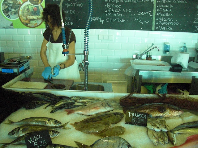 Trabajadora de la Cetarea limpiando pescado en el puesto dentro del propio Restaurante mariñeiro.